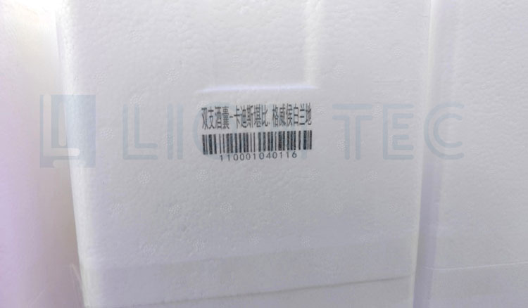 紅酒玻璃瓶由于其易碎性,在運輸過程中需要裝箱在泡沫箱內,能有效防止酒瓶直接相互碰撞。傳統(tǒng)泡沫紙箱外包裝一般都采用貼標簽的方式進行產品追溯管理,但標簽方式易脫落,且成本也不低。隨著壓電式UV噴碼機的興起,在泡沫箱上也可以實現(xiàn)無接觸在線噴碼,其高附著,耐摩擦,噴印清晰,成本低等優(yōu)點,是替代標簽的經(jīng)濟性與環(huán)保性的理想選擇。