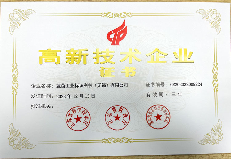 近日,藍茵工業(yè)標識科技(無錫)有限公司喜獲國家級“高新技術企業(yè)證書”,成為國家高新技術企業(yè),并頒發(fā)了證書。此次藍茵LIONTEC取得的《高新技術企業(yè)證書》,發(fā)證審批機關分別為江蘇省科學技術廳、江蘇省財政廳、國家稅務總局江蘇省稅務局。證書的頒發(fā)充分說明了國家相關部門對藍茵