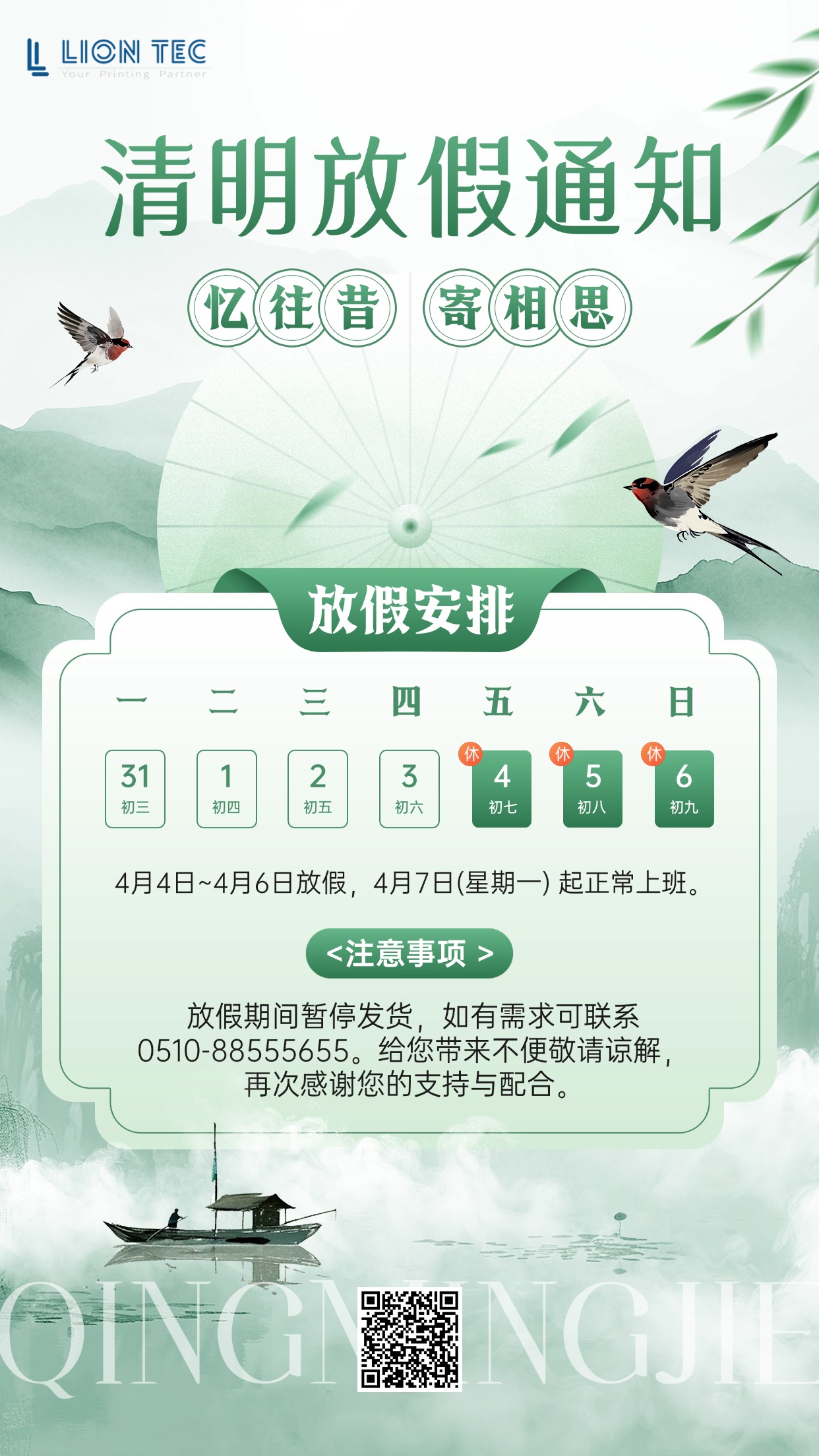 人間四月芳菲盡,春風落日寄哀思。清明,是慎終追遠的時節(jié),是對親人的思念,更是文化的傳承。清明節(jié)即將到來,根據(jù)國家法定節(jié)假日規(guī)定,噴碼機廠家藍茵現(xiàn)將 2025 年清明節(jié)放假安排通知如下: