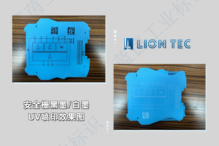 客戶在藍茵通過UV噴碼機打樣的安全柵產(chǎn)品的效果圖。噴印內容包括線路圖標識、二維碼,一面打黑墨,一面打白墨。