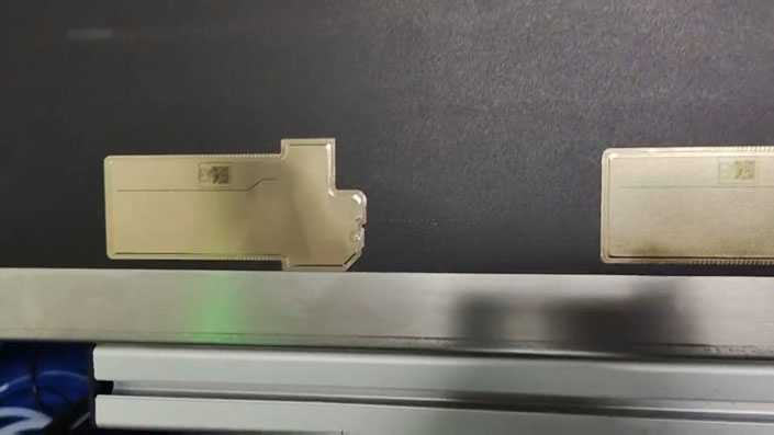 手機模組配件要在其玻璃材質表面噴印二維碼、文本內容,文本內容與二維碼底色采用了白墨噴碼方式,二維碼采色黑墨,黑白對比,二維碼內容更易識別。?對于光滑的玻璃表面,UV噴碼機噴印可以做到高附著力,高清晰,二維碼易識別的效果。