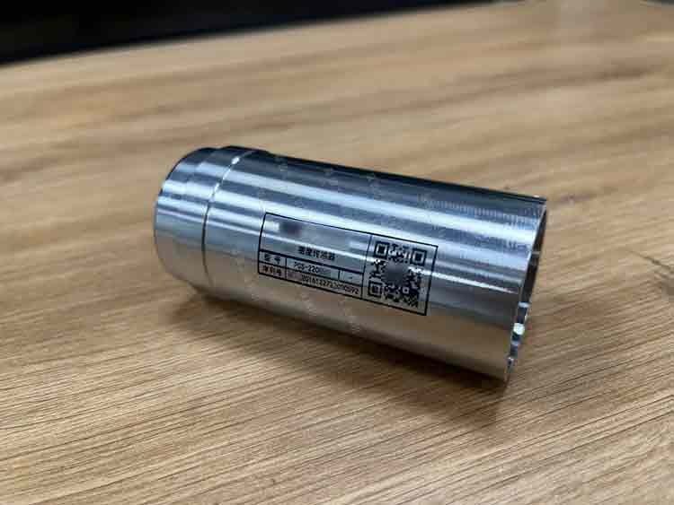 UV噴碼機(jī)在不銹鋼圓柱形密度傳感器鋼套鋼管的柱體弧面上進(jìn)行規(guī)格信息、二維碼的噴印,字體效果清晰,二維碼易識(shí)別